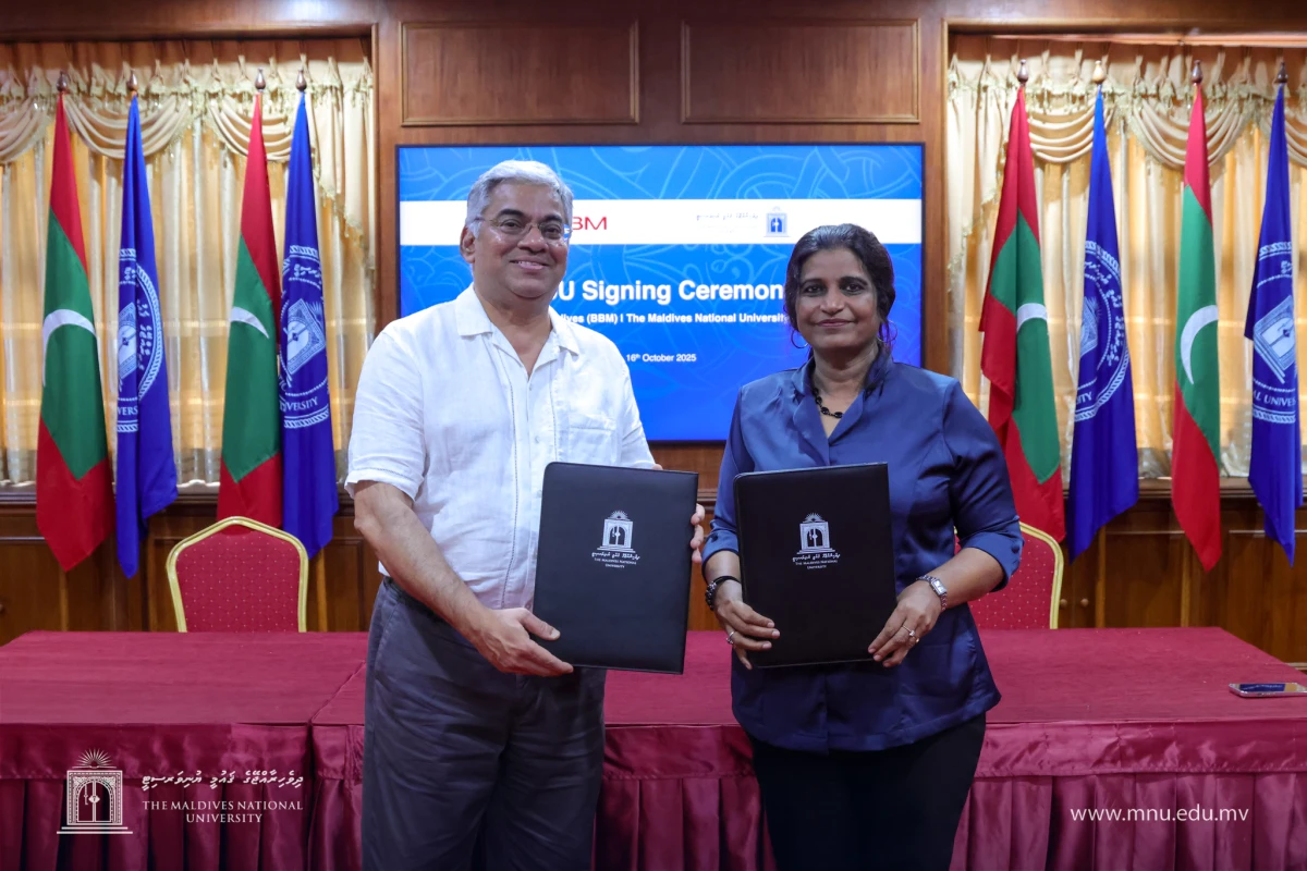 The MoU was signed by Dr Aishath Shehenaz Adam, Vice Chancellor of MNU, and Ismail Hilmy, Chairman and Managing Director of BBM, during a ceremony attended by the university’s Chancellor Dr Mahmood Shaugee, senior management, and representatives from both organisations.