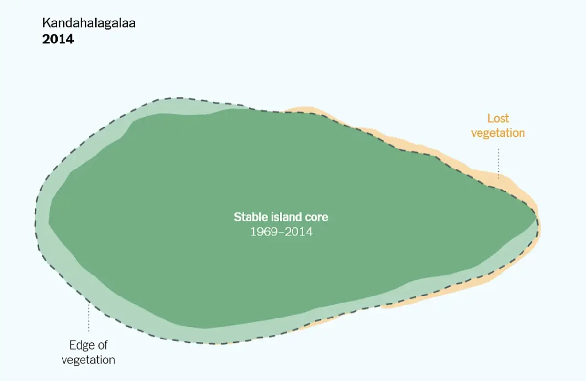 In Kench’s research, he also uncovered some of the detailed changes that have taken place in individual islands. The New York Times report showed the shape of the uninhabited island of Kandahalagala in Gaafu Dhaalu atoll.