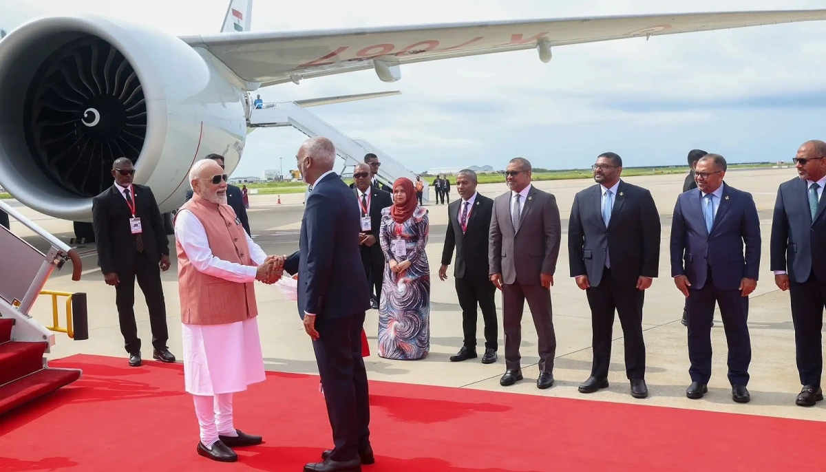 Upon arrival, Modi posted a message in Dhivehi thanking President Dr Mohamed Muizzu for personally receiving him at Velana International Airport Friday morning. His message read: “Landed in Malé. Deeply touched by the gesture of President Muizzu to come to the airport to welcome me. I am confident that India-Maldives friendship will scale new heights of progress in the times to come.”
