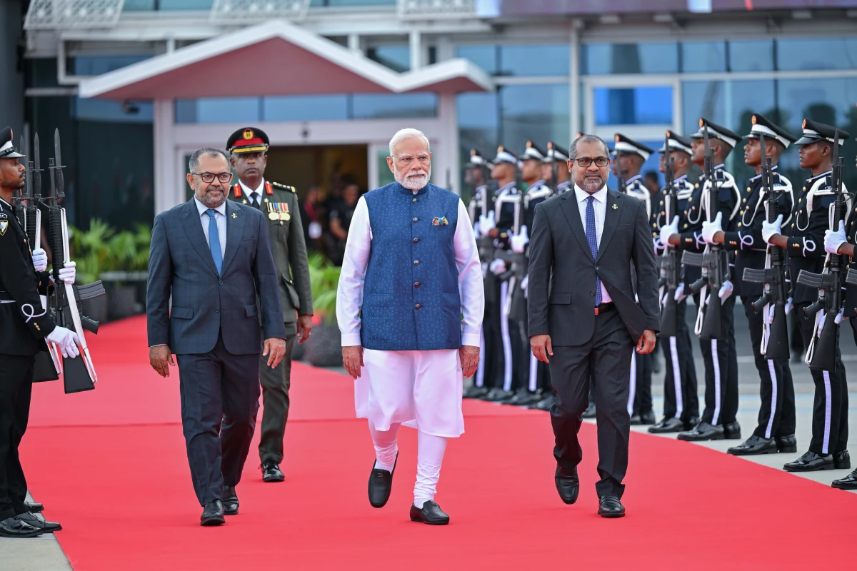 Prime Minister Modi arrived in the Maldives on Friday morning at the invitation President Dr Mohamed Muizzu. The Prime Minister was warmly received at Velana International Airport (VIA) and subsequently accorded a ceremonial welcome in the capital, Malé.