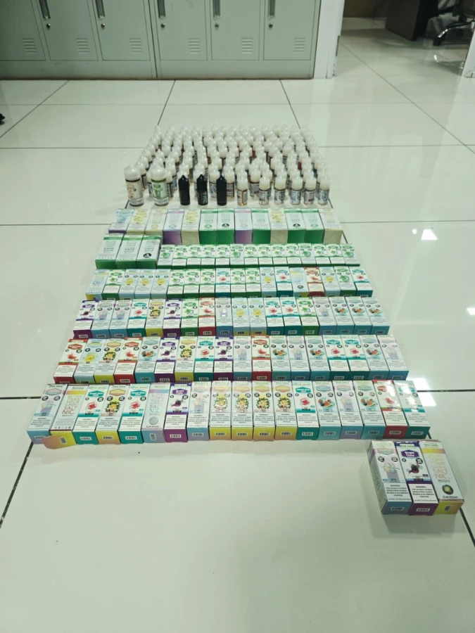 Police have seized more than 200 vape-related items from an apartment in the Hiyaa housing complex during an investigation linked to a domestic complaint.