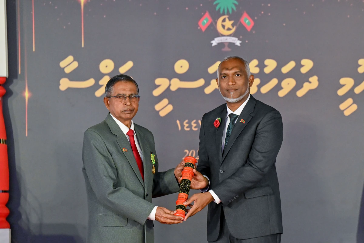 The esteemed national honour was presented at the official National Day ceremony held Sunday morning in Utheemu, North Thiladhunmathi Atoll.
