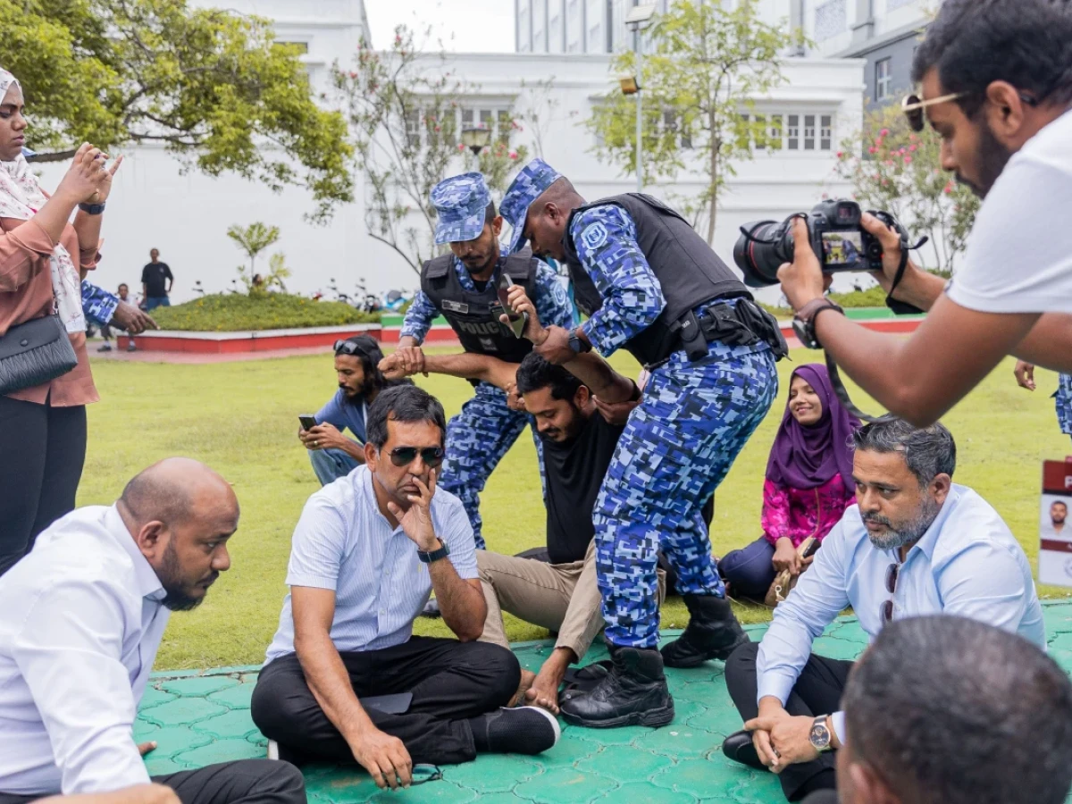 The PPM-PNC leadership gathered at Republic Square on Thursday afternoon to call for the release of opposition presidential candidate, former President Abdulla Yameen. Seven people, including MPs, were arrested.