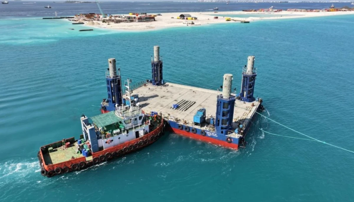 The platform, called 'Maharaja', brought by India's Afcons, was launched on Friday. Using the platform, a total of 24 pillars will be erected in the shallow areas between Male and Villimale.